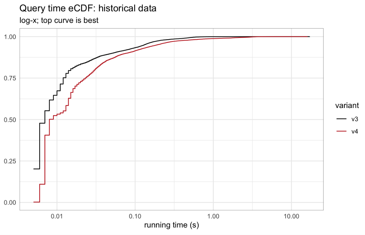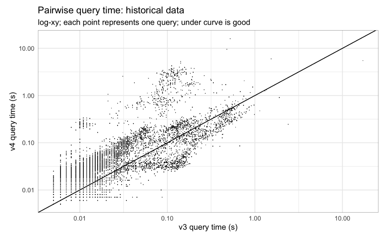 For historical data, long-running queries were more frequent in v4 than in v3, but not more severe. In v3, only 8 queries required more than one second to compute, and the longest-running query took seventeen seconds; in v4 over two hundred queries needed more than one second, but the max query time was sixteen seconds.