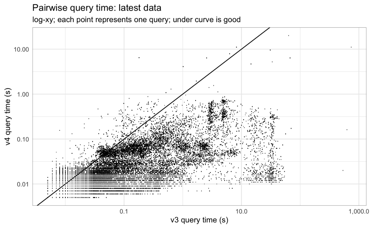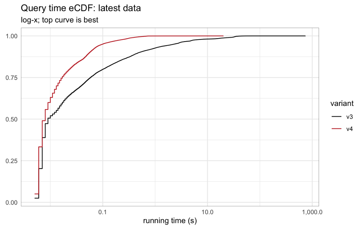 The largest factor in the query time improvements for latest data is a reduction in the frequency and severity of long-running queries. In v3, over seven hundred queries required over ten seconds to compute, and the longest-running query took twelve minutes; in v4 only three queries needed more than ten seconds and no query took more than twenty-one seconds.