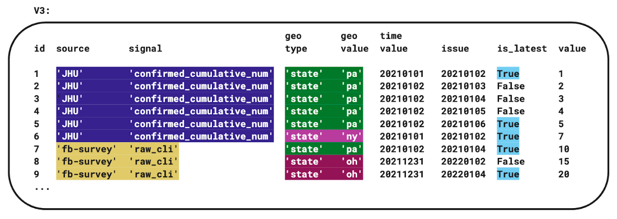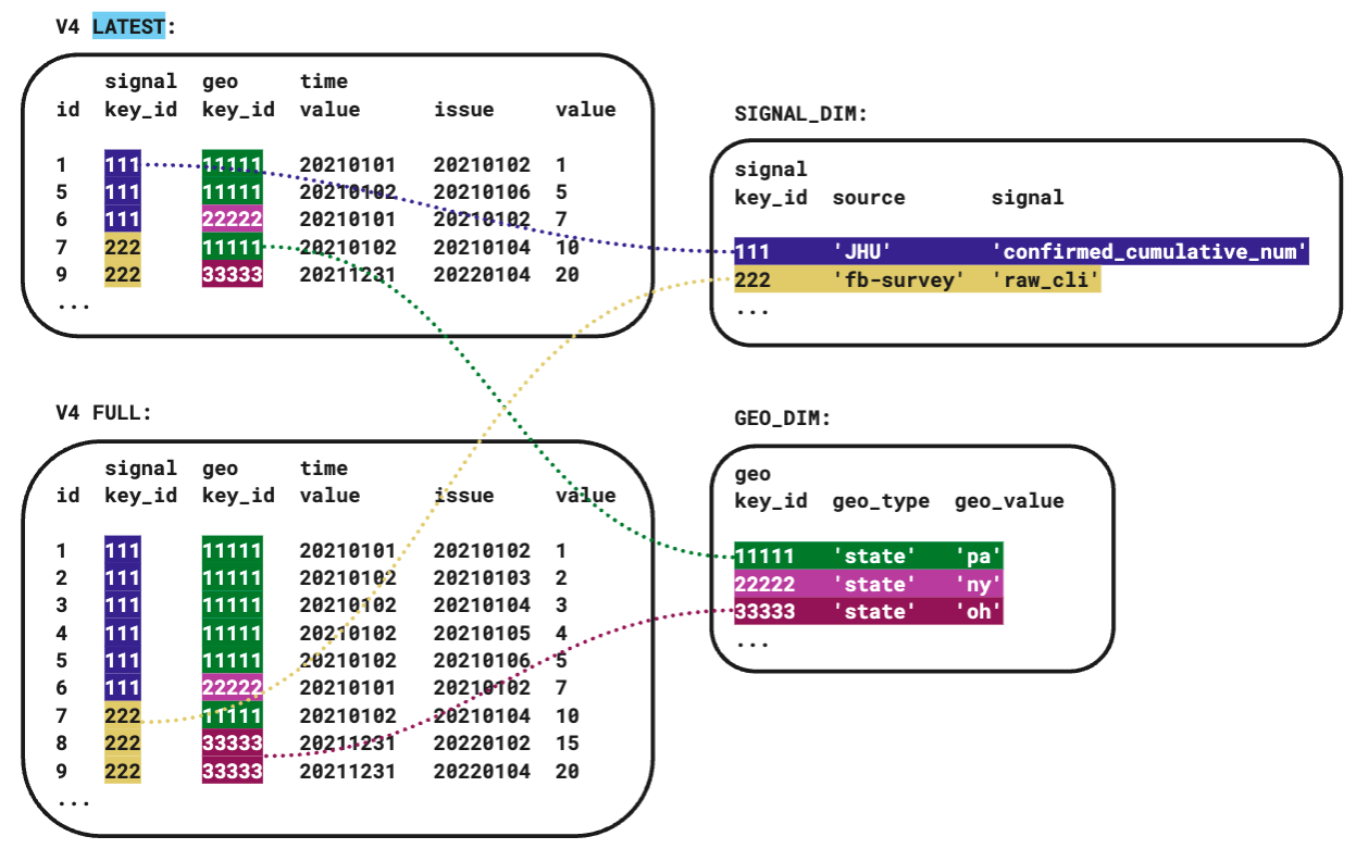 is_latest column:source, signal, time_type, time_value, geo_type, geo_value) tuple had the is_latest flag set. This flag had to be unset when newer data was added, but left in place when older data was patched. System faults while data was being loaded could leave the records in an inconsistent state where two or more, zero, or the wrong rows had the flag set. Detecting problems with this flag was computationally expensive.source, signal, geo_type, geo_value). Since the duplicated information was also the most common selection criteria, the indexes took up a disproportionate amount of space on disk relative to the size of the base dataset.Our initial v3 schema was based on a single-table design. This worked well for a time. Each row represented a data point in its entirety, the most significant being: